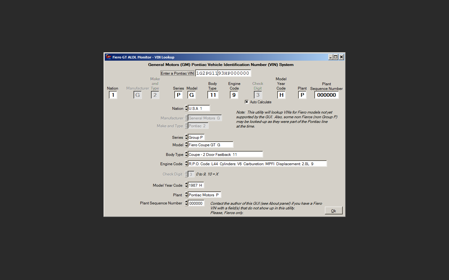 Fiero GT ALDL Diagnostic Tool - VIN Lookup Utility